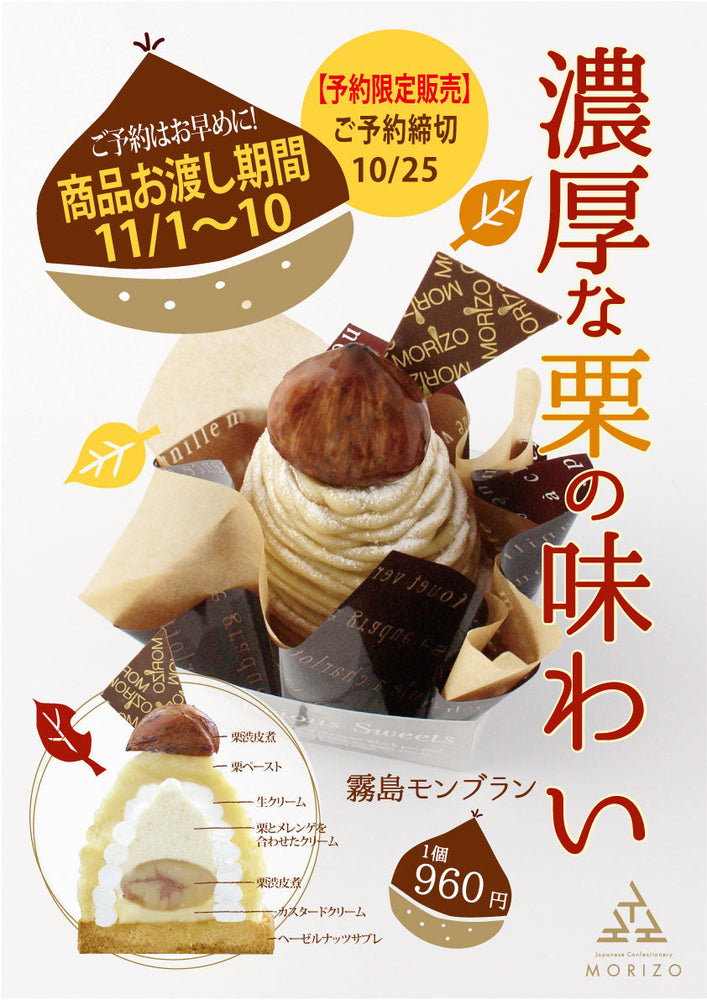 稀少な霧島栗を使用した森三秋の風物詩🌰 森三の「霧島モンブラン」を今年も予約限定で販売いたします! 商品お渡し期間:11/1(土)~11/10(月) ※ご予約締切日:10/25(土)※ 栗ペーストを贅沢に使って、色々な味わいを何層にも重ねたたっぷりな味わい。 濃厚な霧島栗の味わいをぜひお楽しみください。 Share ← 古い投稿 新しい投稿 → コメントを残す お名前 メールアドレス メッセージ コメントは公開する前に承認する必要があることに注意してください